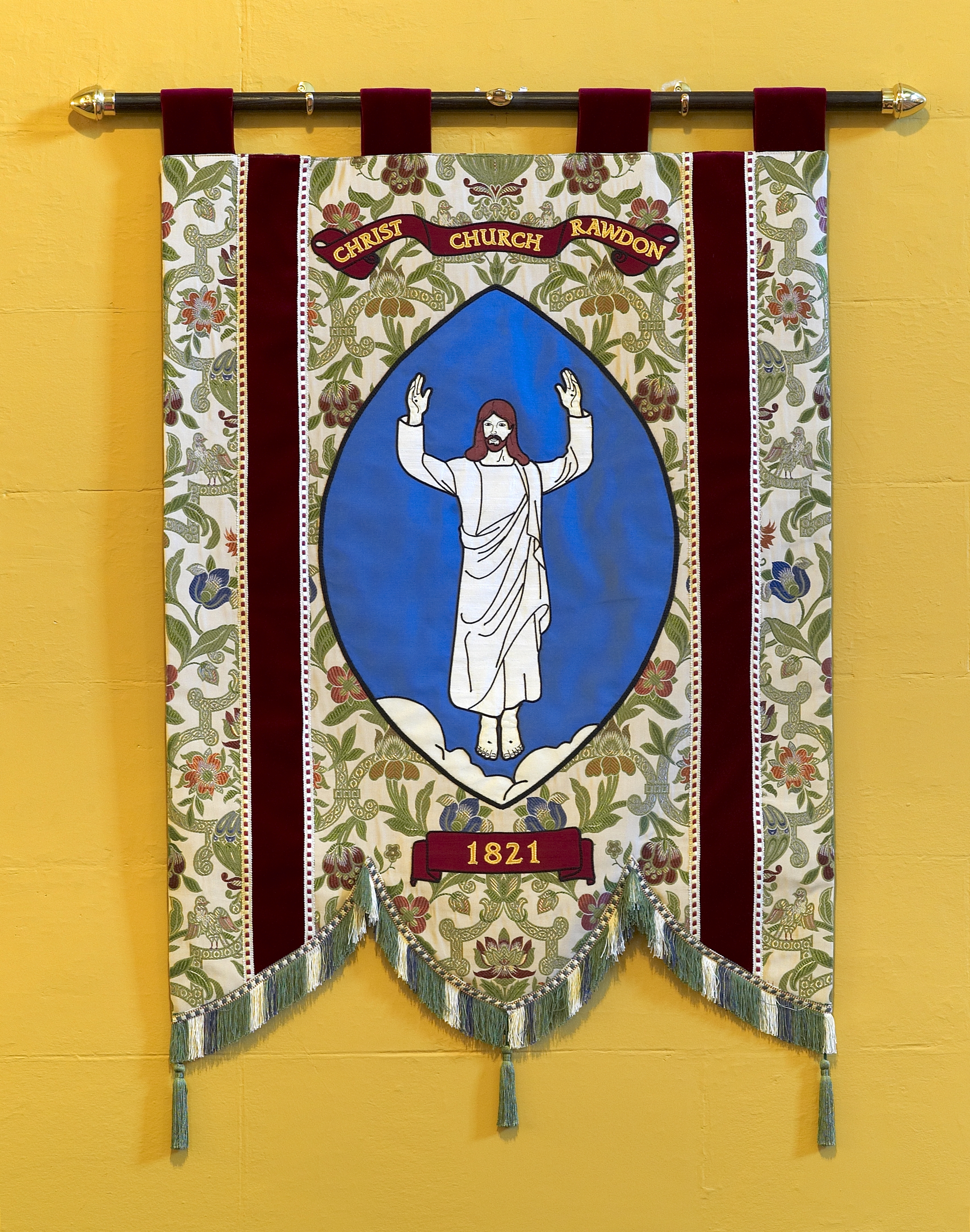 The stained glass window end with the Resurrection of Christ. The other two events in the story of salvation are depicted by two banners. The first banner, located on the right hand side of the church (facing the altar), is the Ascension banner. This banner depicts Christ Ascending after the forty days spend on earth after the Resurrection. The holes in his hands and feet are still there emphasizing that Christ’s experience of suffering humanity is retained after his Ascension. This banner is the Parish Banner.
