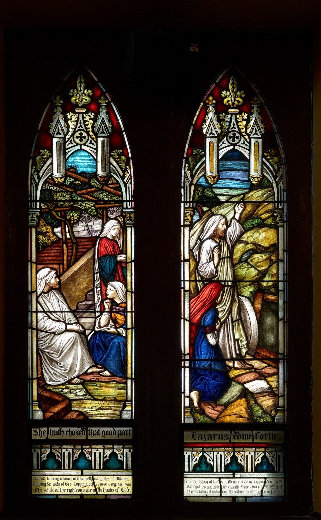 The window to the right depicts the teaching of Christ to Mary and Martha and contemplates the difference between serving and listening. Many people in this world spends too much of their time ‘doing’ instead of ‘being’. These must be balanced, but Christ reminds us that without the ‘being’ the ‘doing’ is not enough. We must take the time to be quiet and reflect on our actions and work. We need to keep a Sabbath day. If our lives are always rushed and anxious we lose ourselves in the chaos. We need to learn to stand still. We are saved through Grace and not works. It is not what is good that is important but what is best as Mary saw.