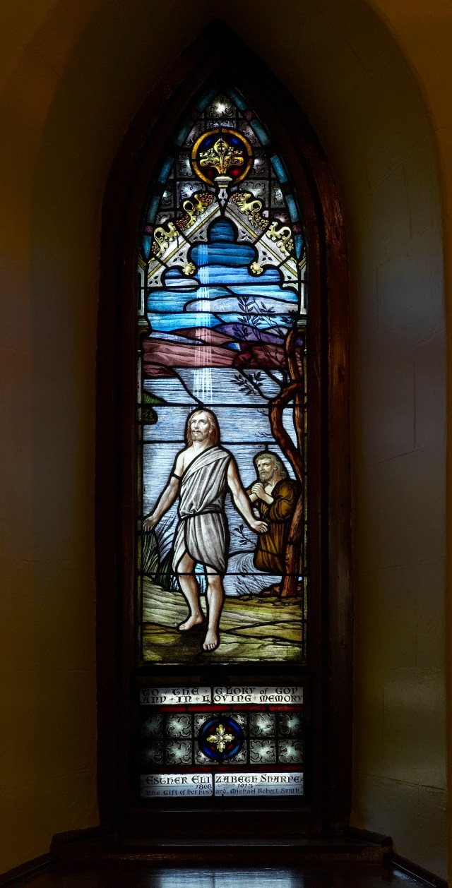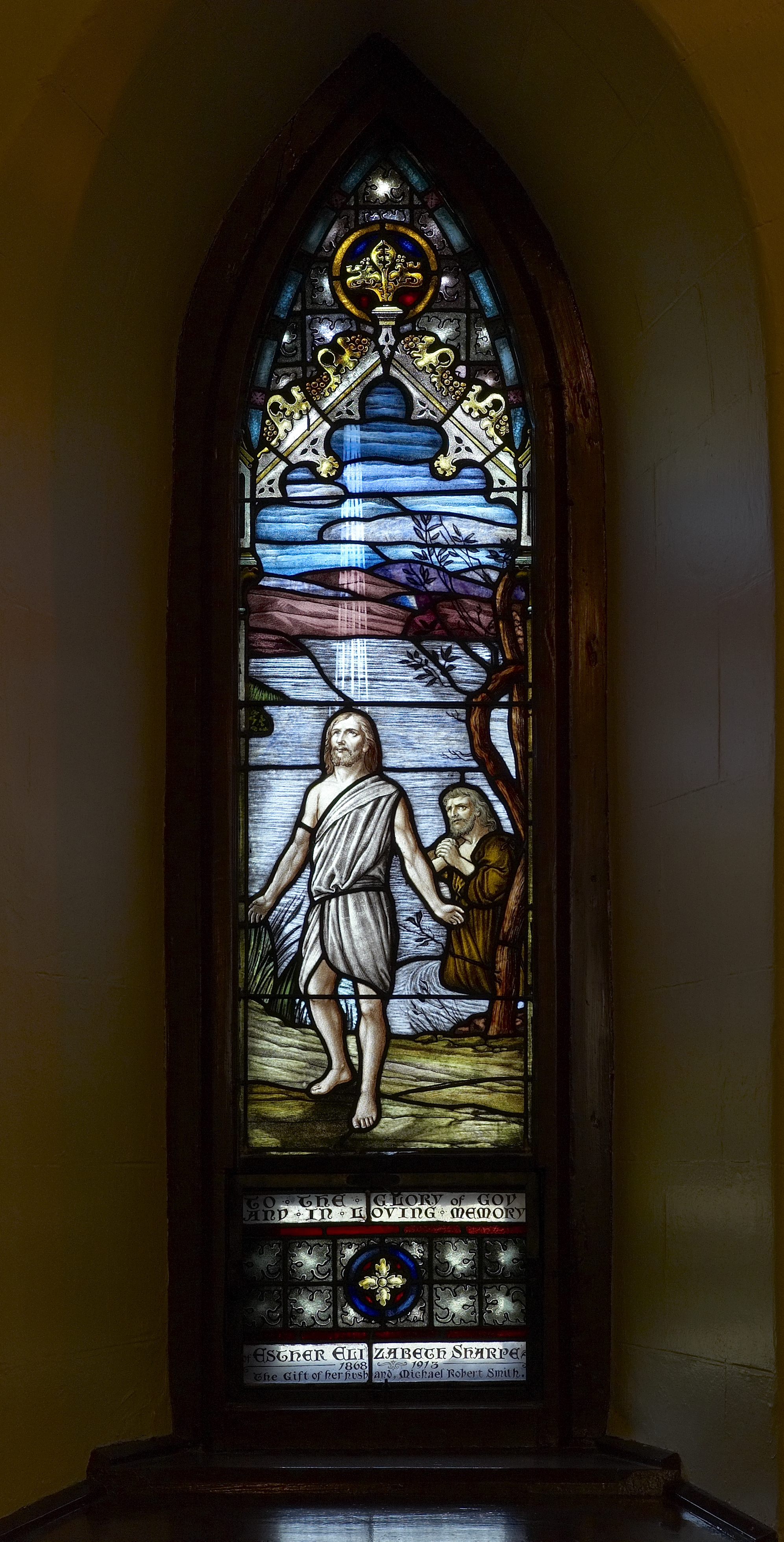 On the right hand side at the back of the Church you see The Baptism of Christ by Saint John the Baptist. The window is placed near the traditional place of the Font. The Font is near the entrance to the church to symbolize that it is through the waters of Baptism that we enter into the Church, the body of Christ on earth. We are baptised into the death and Resurrection of Christ in which we die to the life lived for our own pleasure, power and desires and rise again to a life lived for the greater plan of the Kingdom of God.