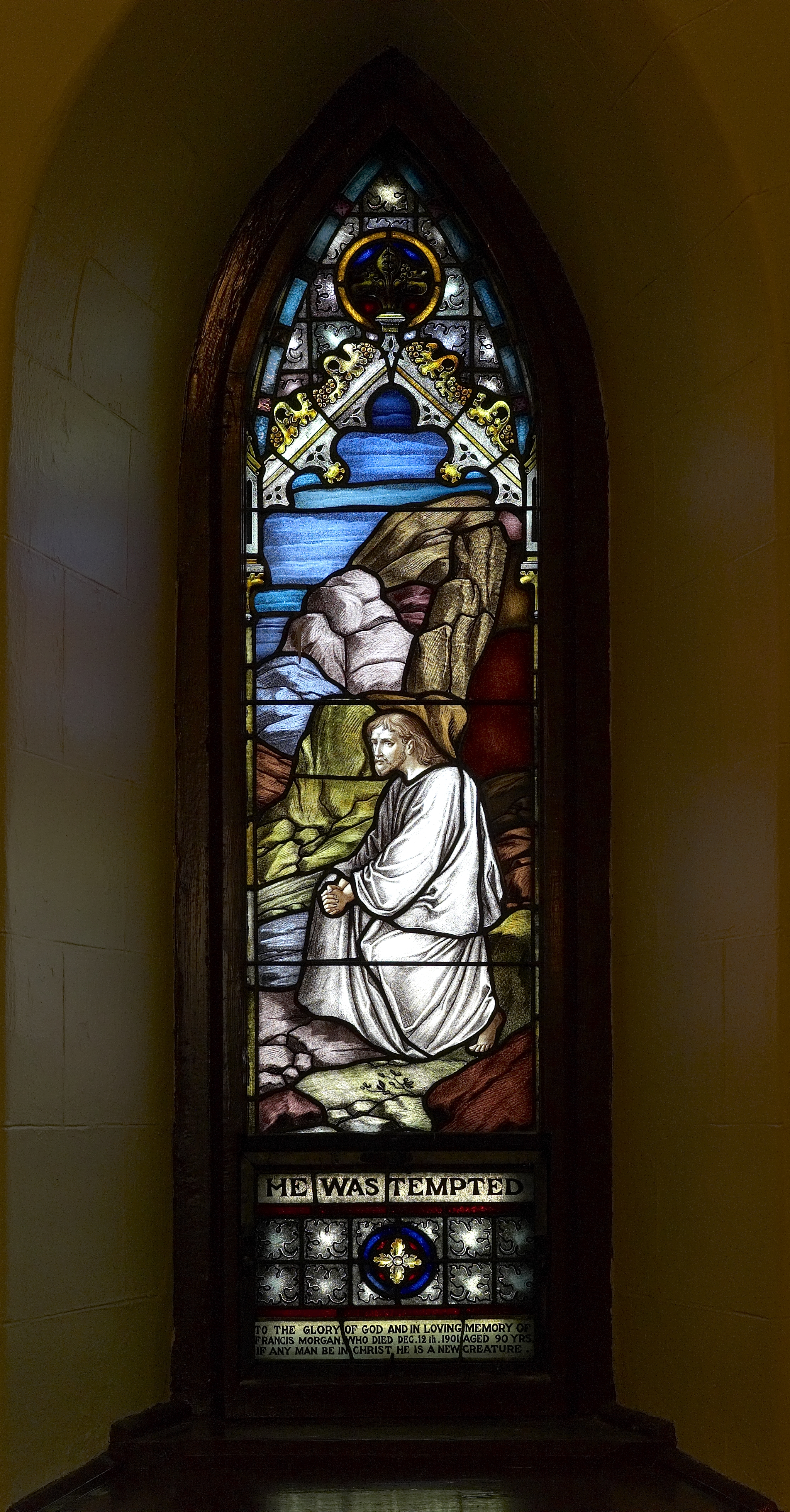 On the opposite side of the nave we see a depiction of Christ in the Wilderness. These two windows compliment one another well as they point to the fact that immediately after his Baptism Christ was driven into the wilderness by the Holy Ghost to be tempted before he began his public ministry. It is a spiritual truth that new birth and growth is beset by temptation and trial. We reflect on this window during the penitential season of Lent which begins on Ash Wednesday. We begin the season with the words “remember man that thou art dust and unto dust shalt thou return, repent and believe in the Gospel.” This is the message that the church has proclaimed to the world throughout the centuries. Remember you only live this one life and therefore every day is important and precious. We will all one day die so we must make our lives count. Turn again from fruitless paths of seeking power, riches and the desires of the flesh and turn to the Good News (Gospel) of life and live.
